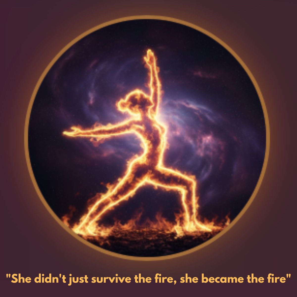 Es la silueta de una mujer en la postura de la guerrera, formada por un resplandeciente fuego dorado y polvo de estrellas.